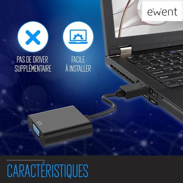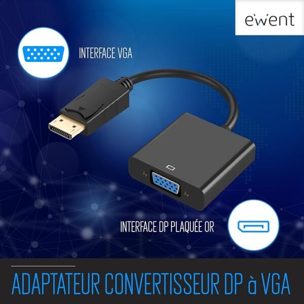 - L’adaptateur Ewent est conçu pour connecter directement votre ordinateur avec une sortie DisplayPort, un ordinateur portable ou une carte graphique à un moniteur, un écran ou un projecteur avec une entrée VGA. Il est idéal pour la diffusion en continu d’événements sportifs, de jeux ou pour étendre votre poste de travail sans avoir besoin de pilotes supplémentaires ou d’alimentations externes.