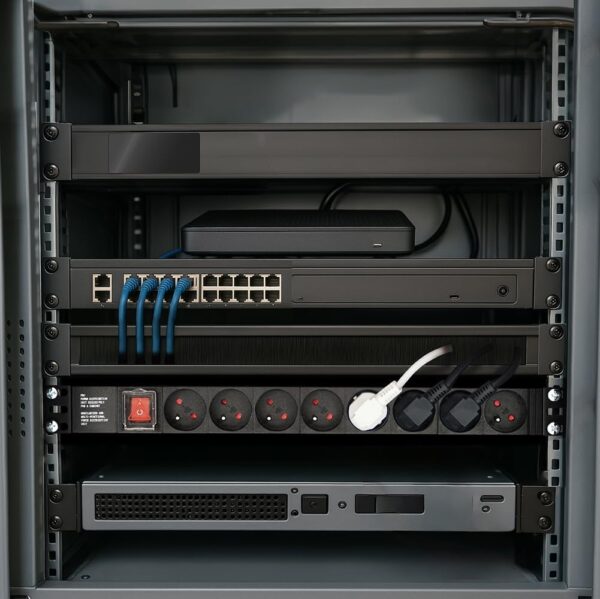 - Multiprise Bandeau 8 prises type schuko, rackable 19″ pour Coffret / Armoire / Baie réseau ou serveur 19″