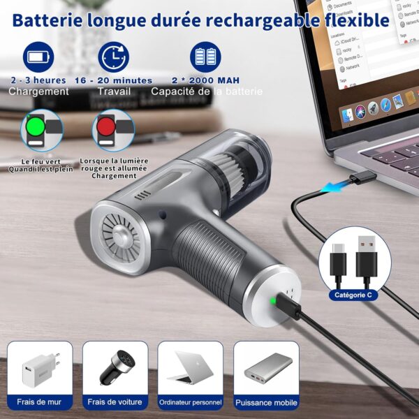 - 【Charge rapide et batterie longue durée】L’aspirateur portatif sans fil a utilisé un moteur à haut régime et adopte un câble de charge Type-C, et il faut environ 2 à 3 heures pour une recharge complète.L’indicateur de charge passe du rouge au vert, fonctionnant en continu pendant 20 à 25 minutes, offrant un nettoyage durable et efficace pour votre voiture.(Remarque : veuillez charger complètement avant la première utilisation).