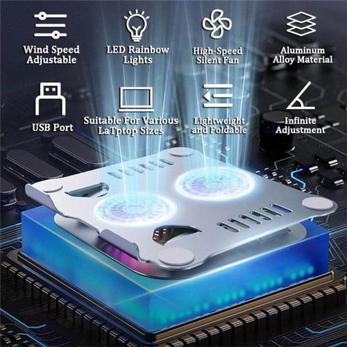 - 【Super refroidissement avec 2 ventilateurs RGB】Turbocompresseur double cœur + design ouvert pour un refroidissement silencieux à 360° de votre PC. Notre support d’ordinateur portable avec ventilateur éclairé RVB améliore considérablement la ventilation sous votre ordinateur portable et réduit le risque de griller votre carte mère.